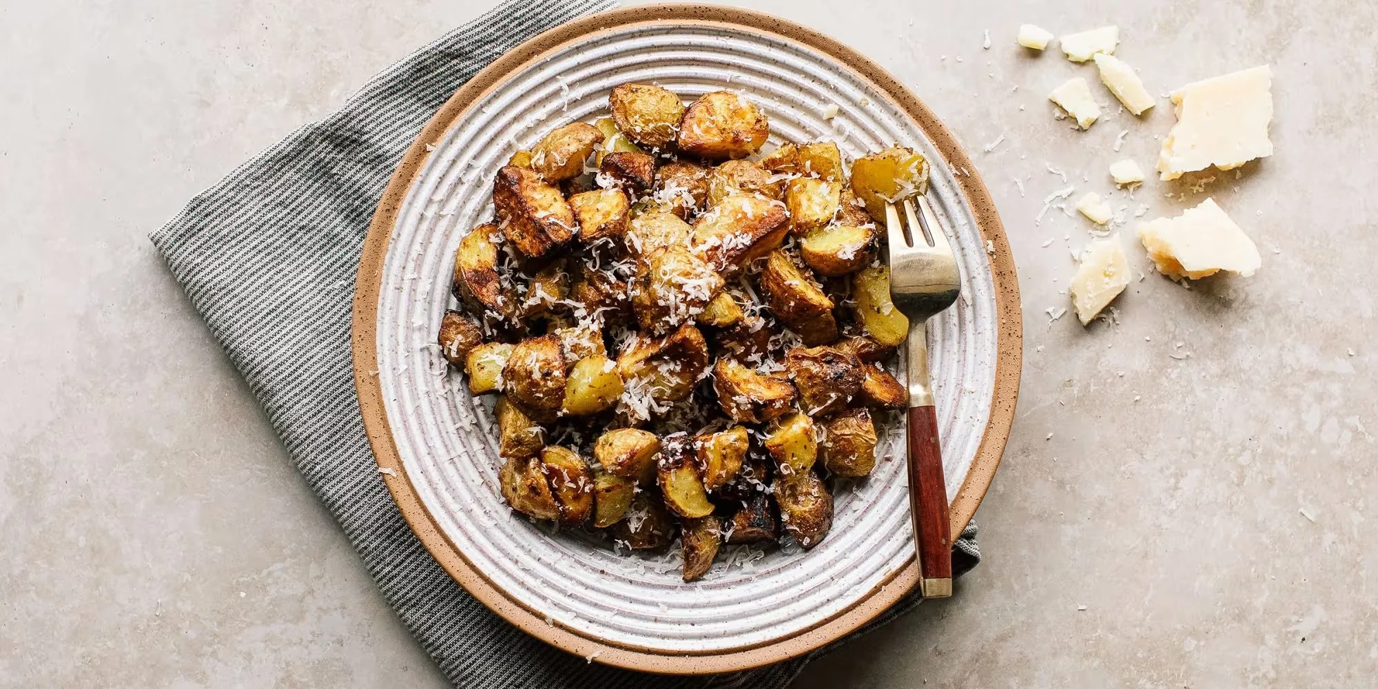 Air fryer potatoes are a way to make delicious roasted potatoes without taking up precious space in the oven. Bookmark this recipe now and reference it come the holidays when you consider adding a double oven in your kitchen. The air fryer produces crispy, tender spuds in just 20 minutes. I like to use yellow gold potatoes because they crisp up beautifully but stay remarkably creamy inside. A basic combination of olive oil, salt and black pepper are mainstays in this recipe, but for even more flavor I added dried oregano, garlic powder and freshly grated Parmesan cheese.
