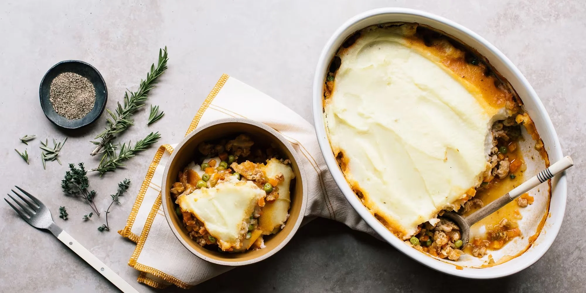 Shepherd’s pie is traditionally made with ground lamb, but for a new version of the comfort food classic, try ground turkey. This protein is just as delicious as lamb but leaner and lighter. Use 93% lean, 7% fat ground turkey, which has a slightly higher ratio of dark meat for a fatty and more flavorful filling. The rest of the filling should look familiar — the browned meat is combined with sautéed onion, carrots, celery and garlic, as well as a trio of fresh hearty herbs (thyme, rosemary and sage).